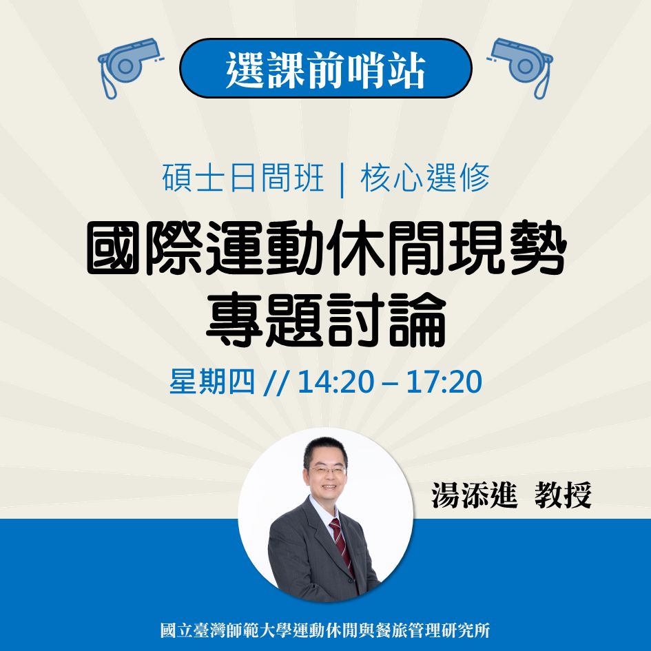 本學期 湯添進老師 在「國際運動休閒現勢專題討論」課程, 將帶各位同學們更加認識國際大型賽會 #奧運(含電子競技、國際體育事務人才培養、AI數位科技導入) 、 #新興休閒運動,以及世界知名的 #職業運動組織 (NBA、MLB、NFL、NH)、 #引領世界潮流 的組織 (NIKE, Adidas, Mizuno等),也會安排 #專家座談 與 #實地訪查! 喜歡運動、欣賞運動賽事及球賽的同學們,是不是很心動了呀! 不要再猶豫了!記得選課時段趕快選下去吧!